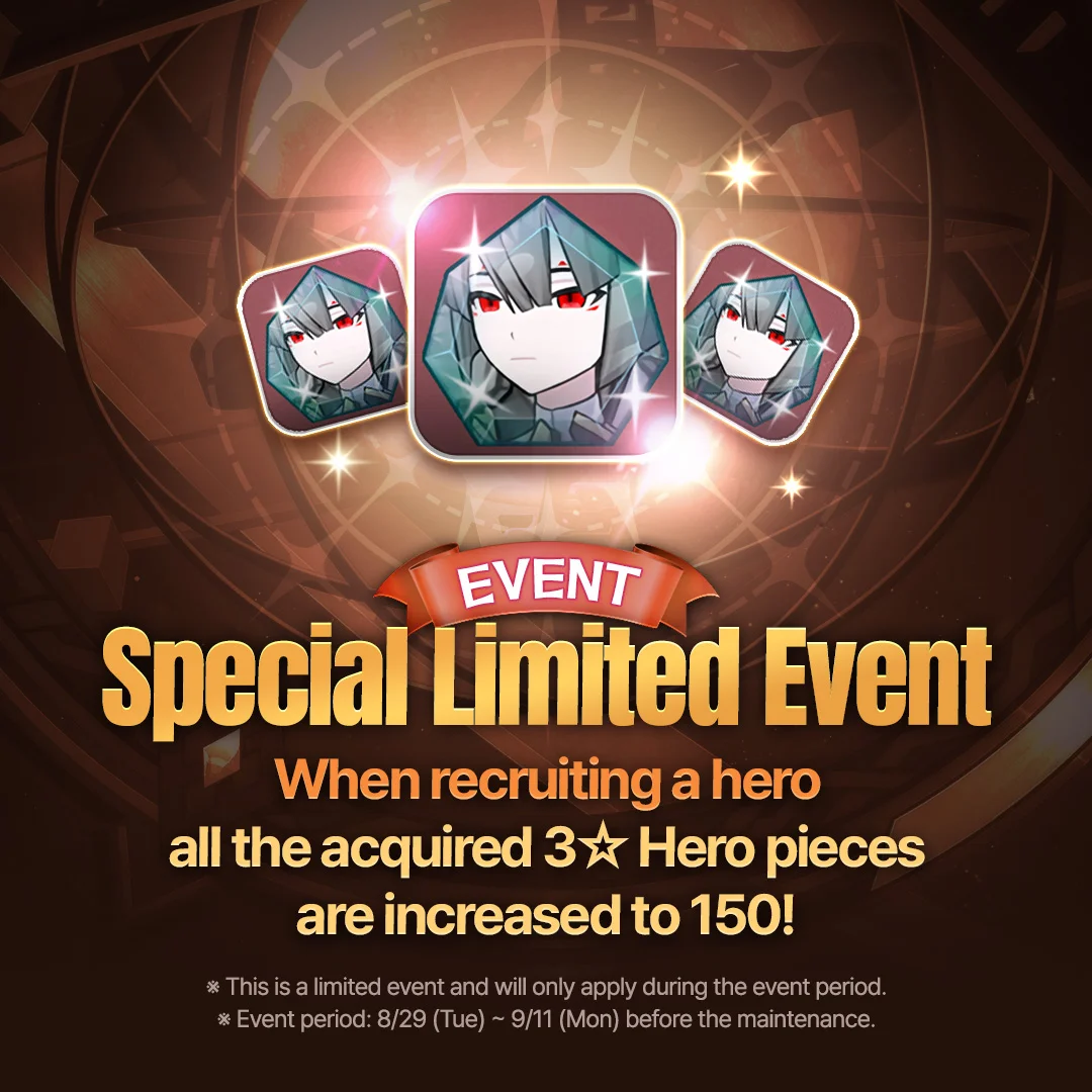 When acquiring duplicate 3☆ heroes who are not the target of the drop rate up banner, the amount of acquired hero pieces is increased to 150.