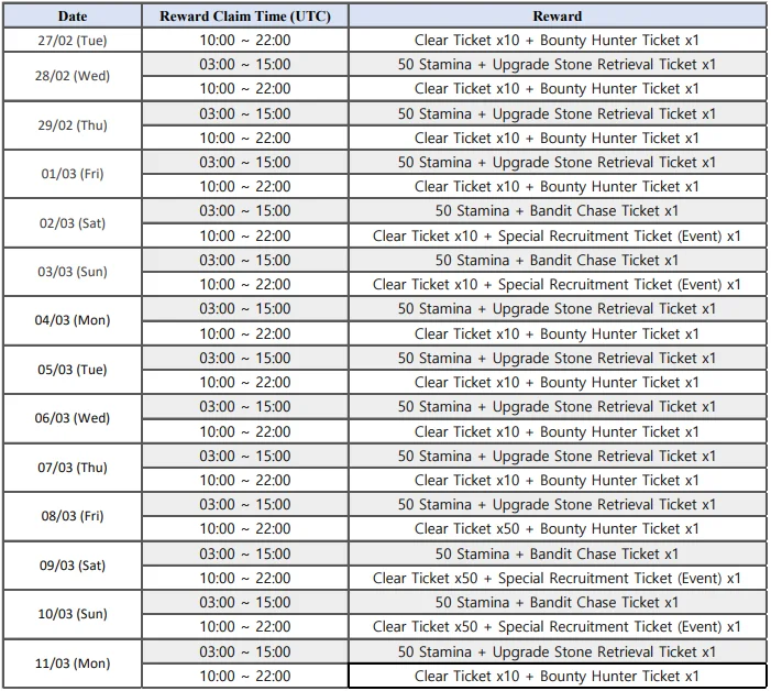 Login to receive abundant rewards! You can receive rewards simply by logging in daily within the given period!Don't forget to claim the rewards!(Added on 3/8) We are providing extra Clear Tickets for you to enjoy your weekend with OUTERPLANE.