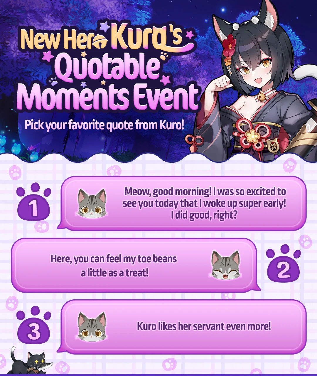 The cute kitty demon Kuro is looking for a new servant!😻 Become Kuro's new human and tell us what line you'd like to hear from her the most! Leave your choice in the comments below to receive a reward! ■ New Hero Kuro's Quotable Moments Event