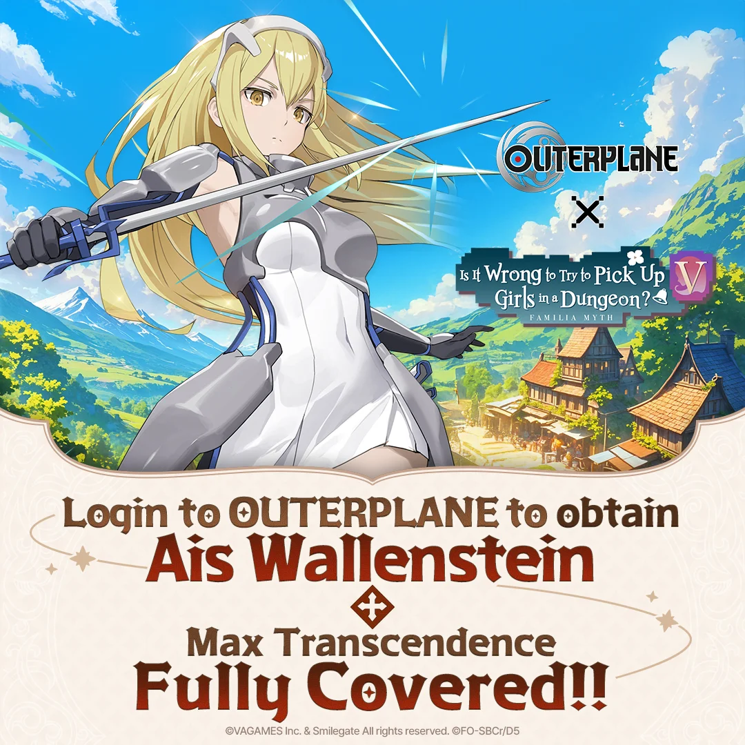 To celebrate OUTERPLANE's first collaboration,we've prepared a special gift for all Mastersto enjoy the festivities to the fullest.Log in during the eventto achieve maximum Transcendence for 'DanMachi' hero Ais Wallenstein!