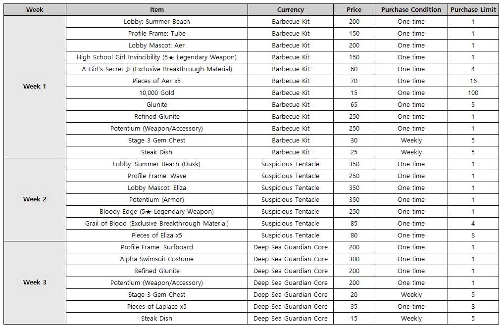 - The areas of the Summer Island event dungeon will be progressively unlocked on a weekly basis.