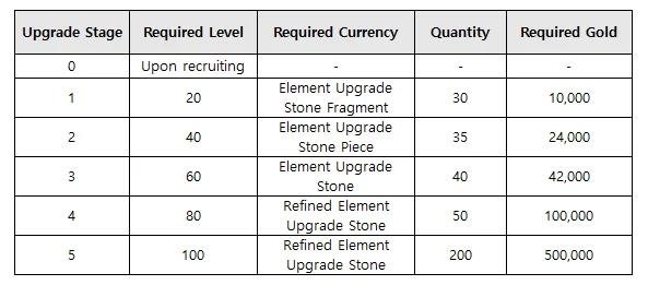 - Please see below for the details of the required currencies for each Upgrade stage.