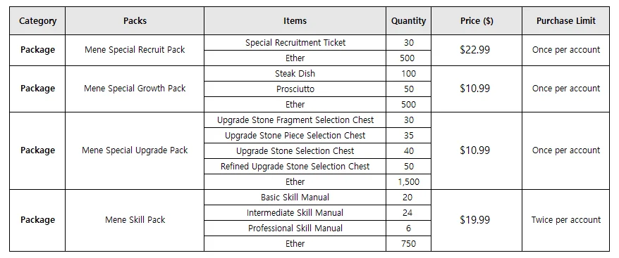 - The purchase limit for Evaās Special Ether Pack and Kās Special Ether Pack will be adjusted from 1 time to 2 times.