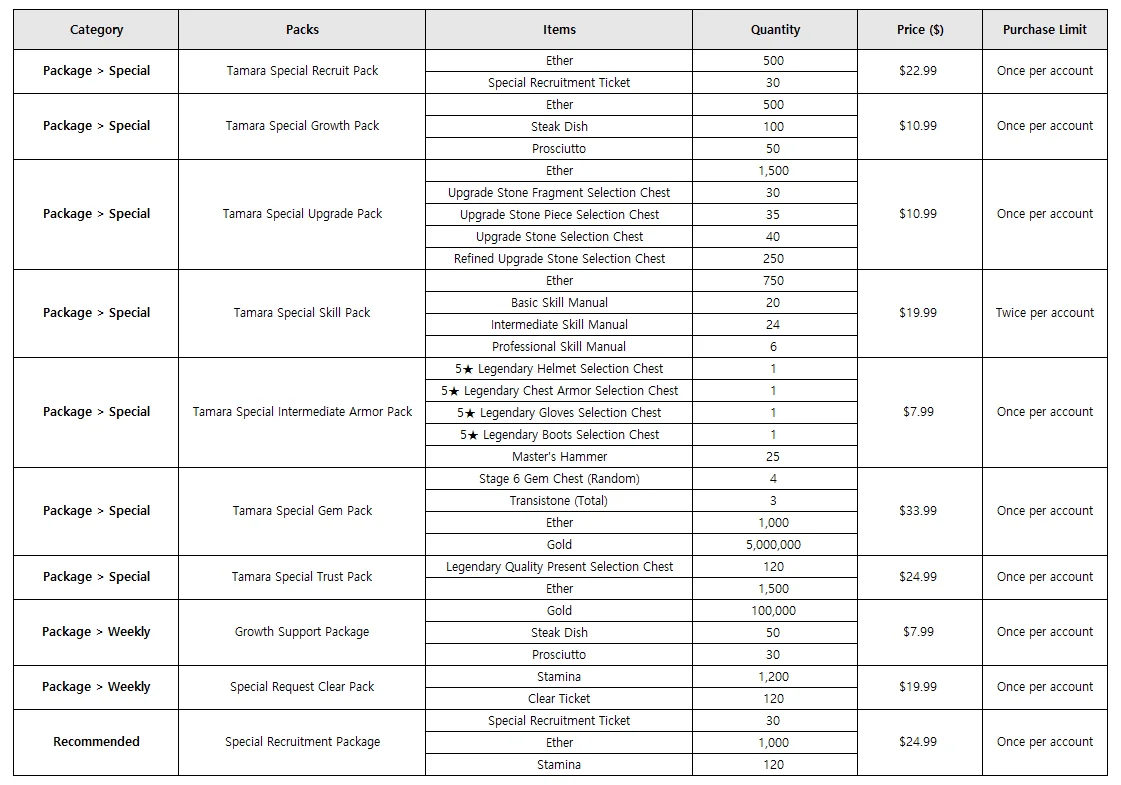 - Seven new packs to celebrate Tamara's Recruit will be added. Additionally, 1 Recommended Pack and 1 Weekly Pack will be added.