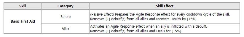 - Adjustments were made to the skill descriptions of "Basic First Aid" for the Hero, Tio, and to the buff description of "Agile Response". No functional changes will be made.