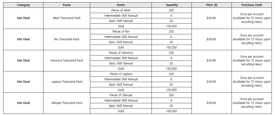 Ā ć“Ā Rin, Veronica, Laplace, and Sterope Transcend Packs will be available upon recruiting existing Heroes or new recruits.