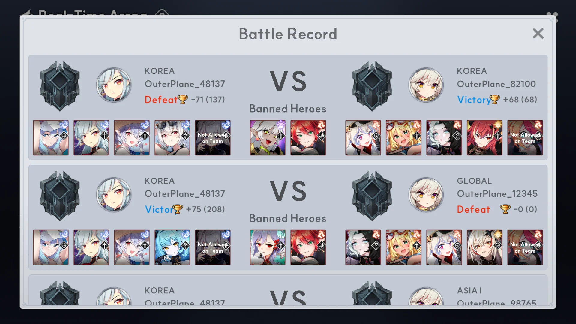 - The tier and points indicated in the Battle Record are determined based on the time of the battle. - In each Battle Record's “Details” section, you can view the heroes that participated in the battle as well as the Bans and Picks made.