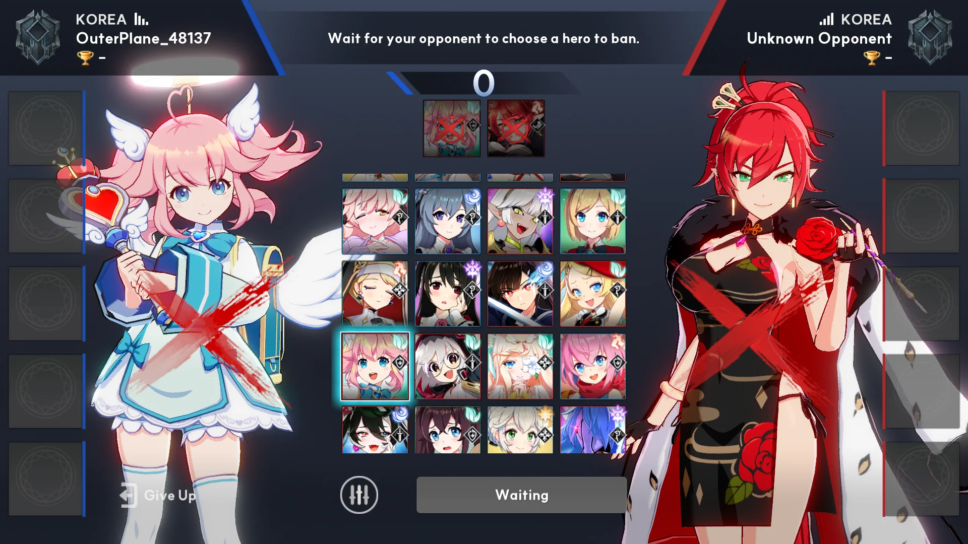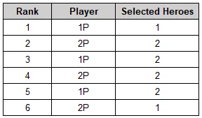 - If a hero isn't chosen within a certain period (20 seconds), a random hero will be selected. - Player 1 and Player 2, selected randomly, take turns choosing heroes following the order indicated in the table below. : After the Hero selection phase concludes, Masters take turns choosing which heroes from their opponent's lineup will be banned from the match.