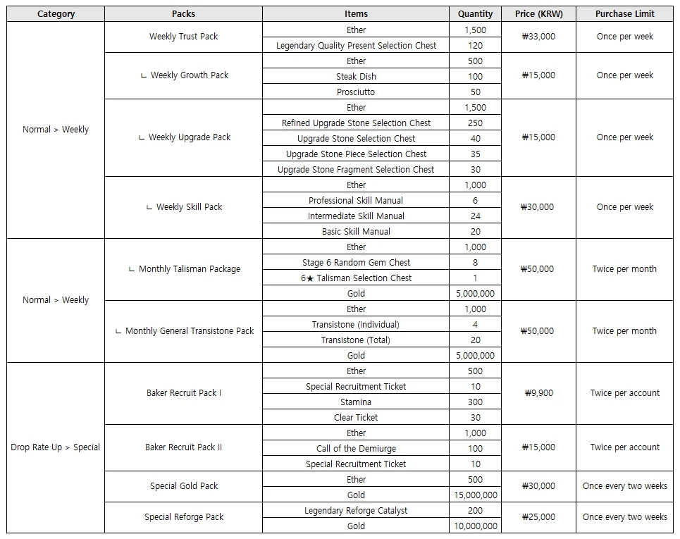 ㄴ Baker Recruit Pack IIㄴ Special Gold Packㄴ Special Reforge Packㄴ Weekly Trust Packㄴ Weekly Growth Packㄴ Weekly Upgrade Packㄴ Weekly Skill Packㄴ Monthly Talisman Packageㄴ Monthly General Transistone Pack