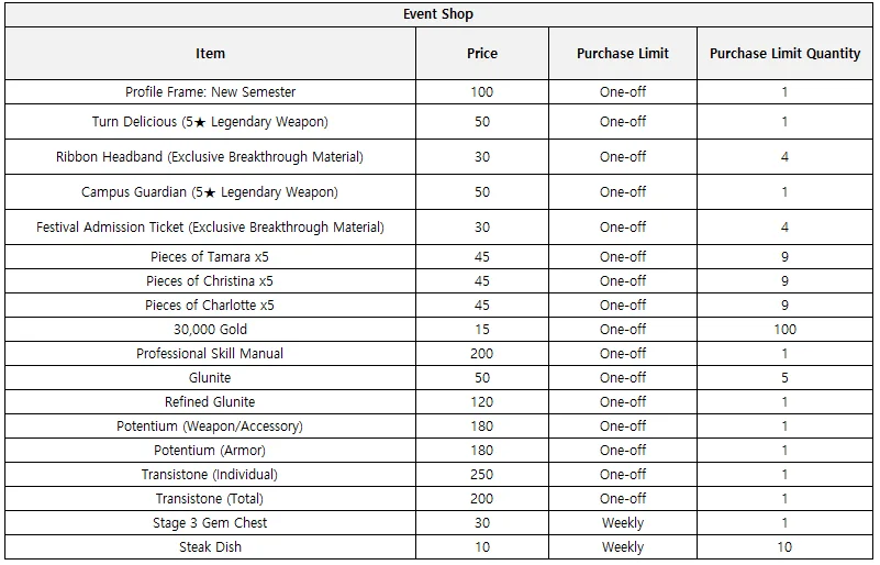 - You will be able to purchase the following items by spending event currency you have acquired.