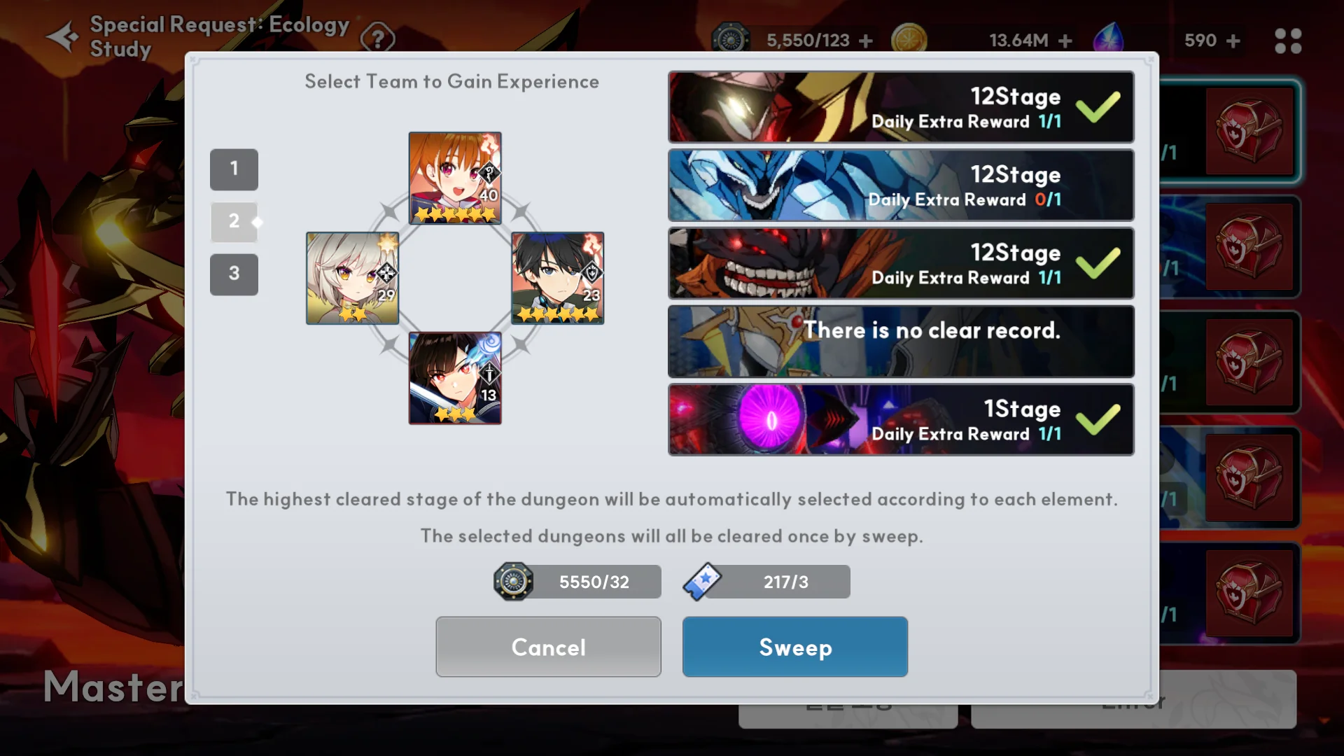 Ā Ā Ā Ā ć“Ā Stamina: Consumed Stamina is aggregated based on the highest level dungeon progress available for each element during Sweep.
