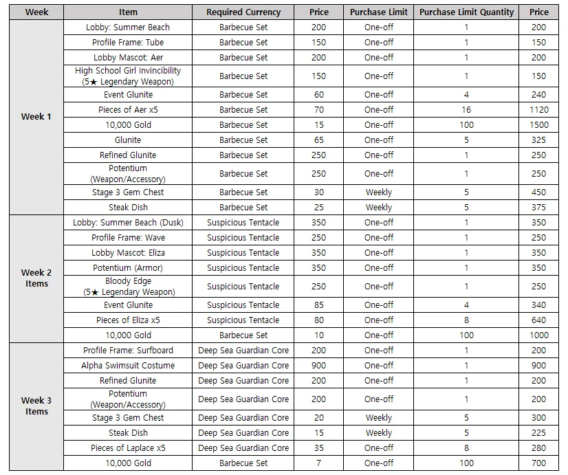 - You can use Barbecue Kit, Suspicious Tentacle, and Deep Sea Guardian Core, which can be obtained by playing through Summer Island Mayhem, to acquire various items.