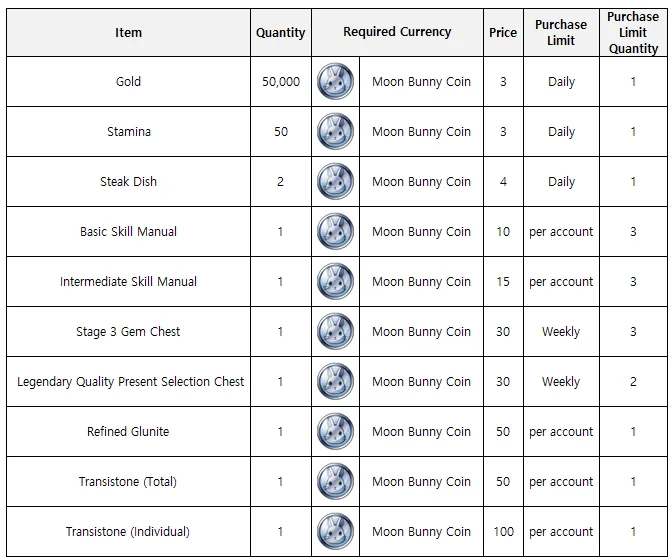 - Players can acquire Moon Bunny Coins by clearing Ecology Study, Identification, or dungeons once.
