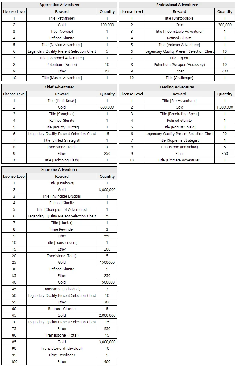 ㄴ The Adventure License is composed of levels 1 to 10 for each rank, and for the final rank, which is Supreme, it can increase up to level 100.