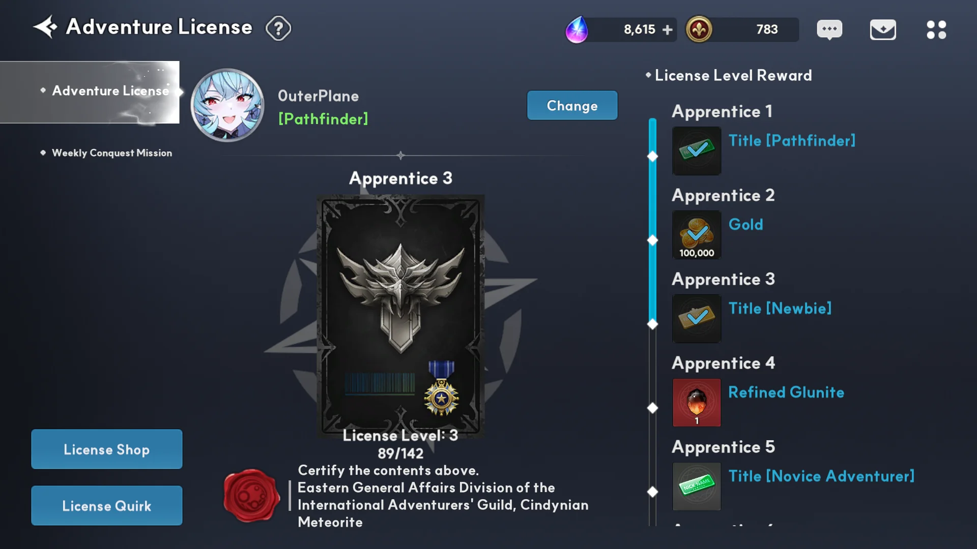 - By repeatedly completing the weekly conquest missions at Adventure License, you can level up the Adventure License to level 10, then increase its rank through a promotion challenge to earn various rewards and titles.
