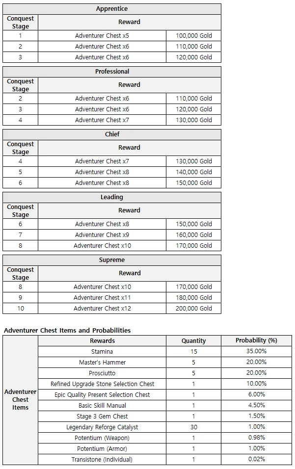 ㄴ The range of weekly conquest mission stages that can be done changes depending on the Adventure License rank.