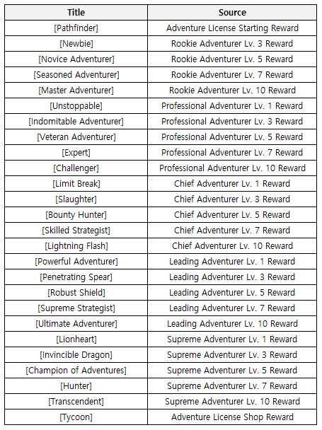 ㄴ Titles can be changed at the Adventure License screen. ㄴ The selected title will be displayed on the user profile, various ranking boards, and the Hall of Fame, but will not be shown in the friends/guild members list.