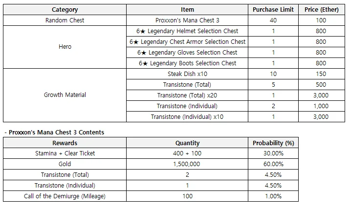 - The event dungeon consists of three parts, and the event shop will be available for 2 weeks.- The event dungeons for Part 1 and Part 2 will be unlocked in the first week, while the event dungeon and Ranked Challenge for Part 3 will open in the second week. - The products (Profile Frame / Lobby Mascot) purchased during the previous event period cannot be purchased again.- Even if you already own a lobby mascot currently for sale, the purchase button may still appear active. (Please note that since you can only own one mascot at a time, avoid making a purchase if you already have one.)- The mission and dungeon clear history previously played will be deleted, and the achievement rewards for each dungeon, as well as the initial dungeon clear rewards, will reset.