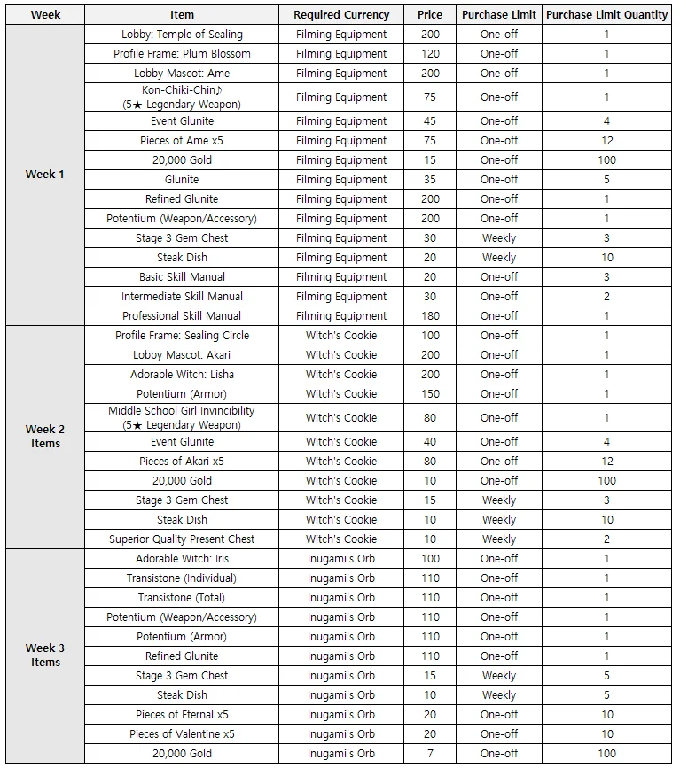 - You will be able to purchase the following items by spending event currency you have acquired.