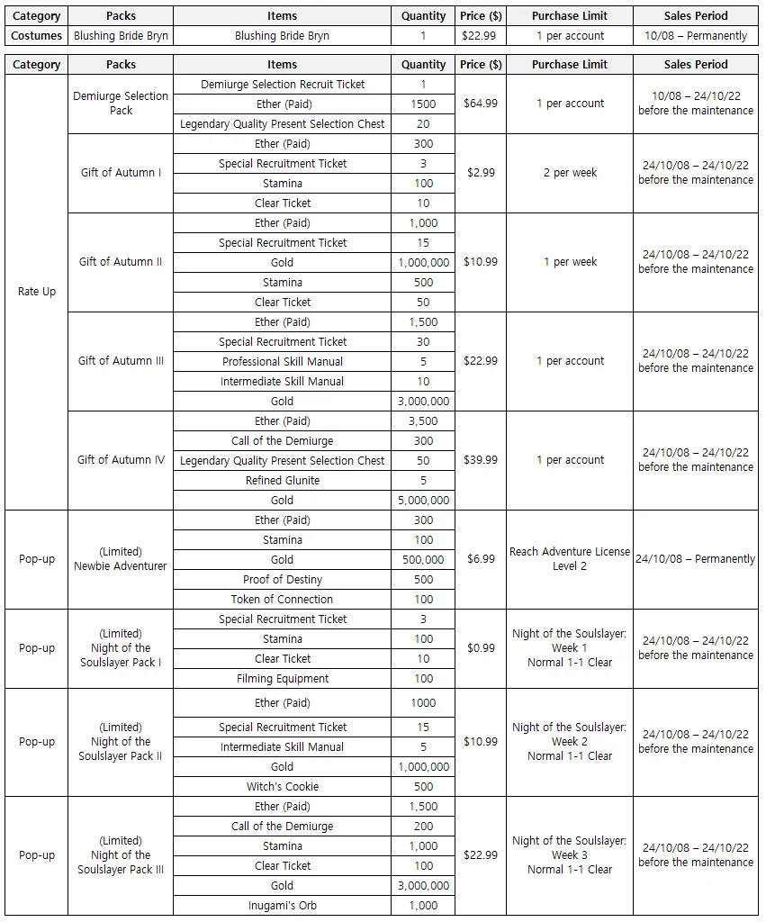 ㄴ Sales Period: 10/08/2024 after the maintenance – 10/22/2024 before the maintenance