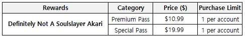 ā»Ā 'Definitely Not A Soulslayer Akari' can be obtained when you purchase the Special Pass.