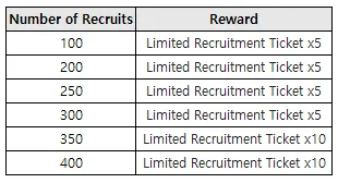 - Rewards will be given in-game based on the number of times you have performed Seasonal Recruitment, as shown in the table below:
