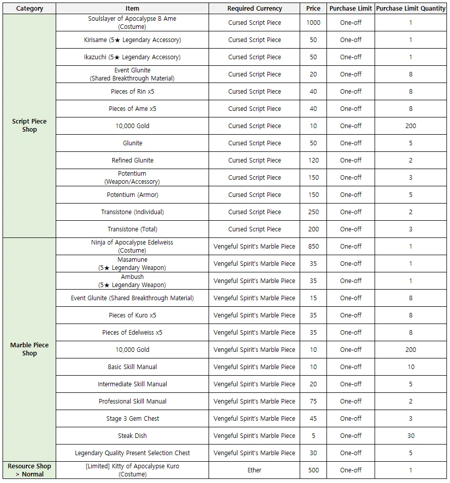Ā Ā - You can use the exclusive currencies, [Cursed Script Piece] and [Vengeful Spirit's Marble Piece], obtained by playing the [Never Stop Soulslayers!] dungeonĀ Ā to acquire various items.Ā