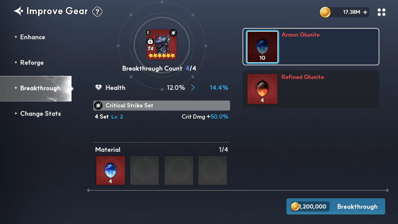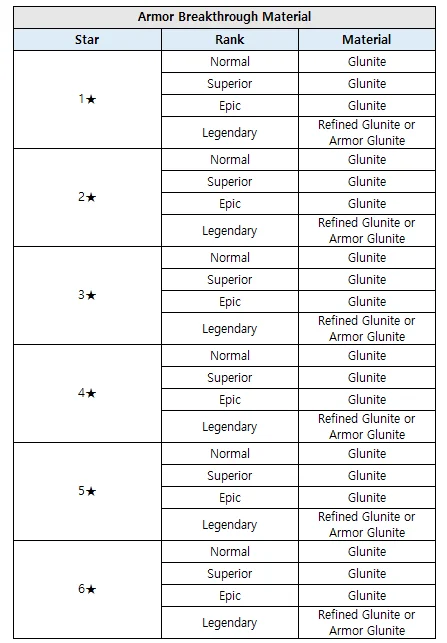 ㄴ You may perform breakthrough using Glunite / Refined Glunite / Armor Glunite. ㄴ You can acquire "Armor Glunite Fragments," which is the material for "Armor Glunite," from Special Request: Ecology Study Stage 13. You can craft Armor Glunites in Kate's Workshop – Consumables Crafting.