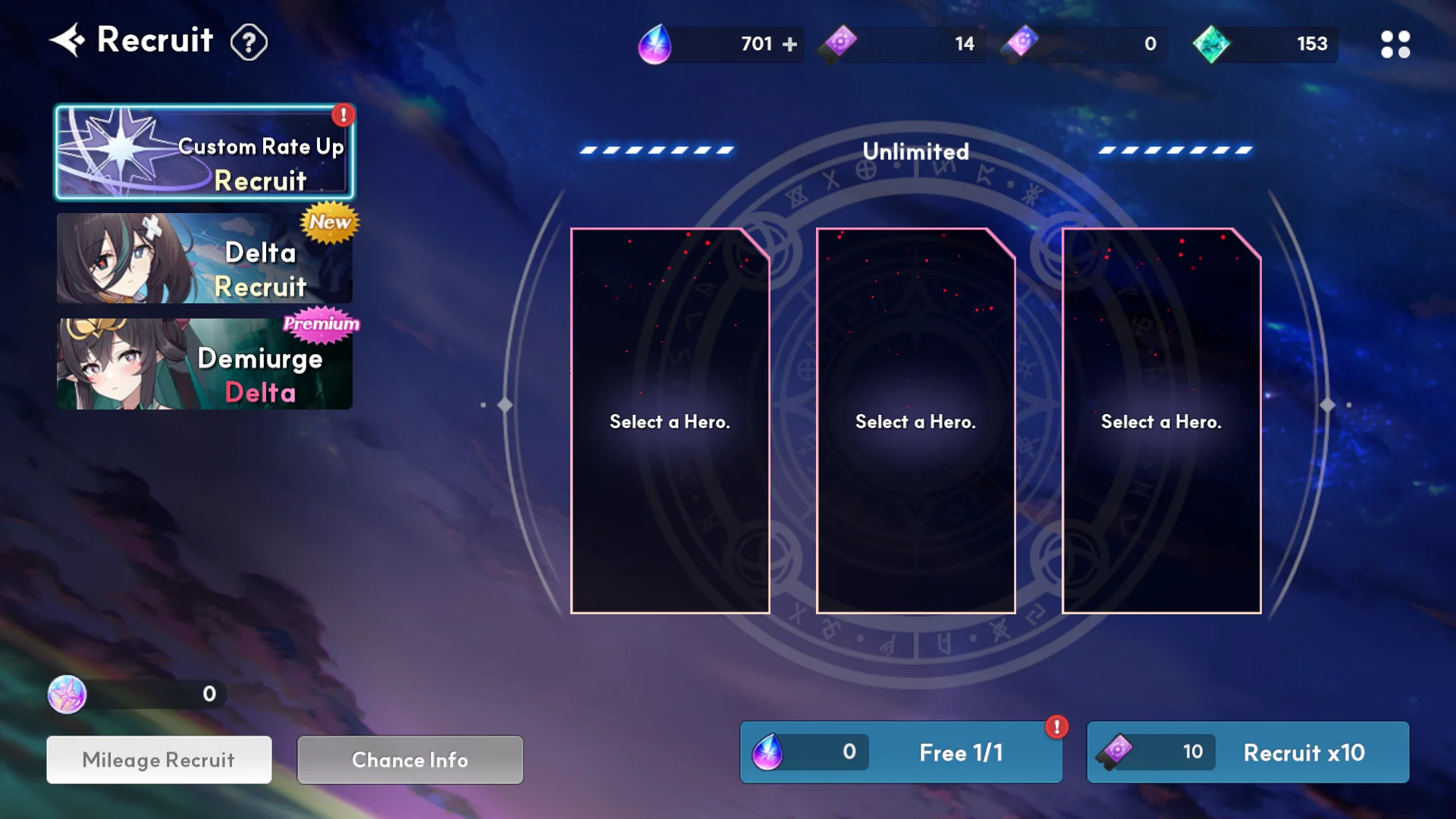 : You can recruit 1 time by using Call of the Demiurge x10. : Call of the Demiurge x10 can be purchased for 225 Ether. You can earn a separate Mileage called False God's Proof in Demiurge Recruitment, and you can spend 200 of this mileage to guarantee you get a Demiurge Hero. - You can perform one free recruit per day, with Mileage (False God's Proof) accumulating. - When performing a free recruit, the chosen recruitment target will be locked, and you won't be able to change the selected target for 7 days.