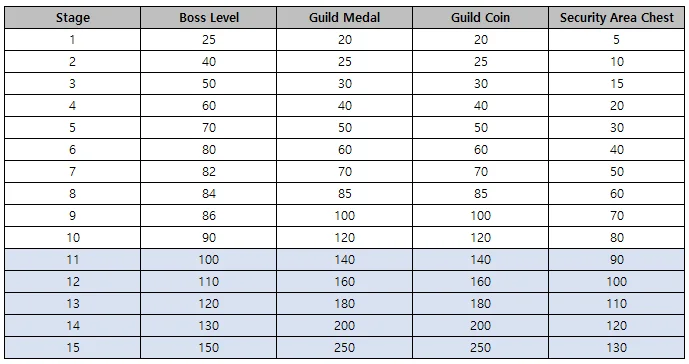 - The amount of Guild Medals, Guild Coins, and Guild Dungeon Chests obtained increases with each completed stage.