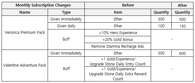 ㄴ The amount of Ether granted immediately upon purchase and the daily Ether distribution will be increased by 50%. ㄴ The initial discount event will end, and all prices will be standardized. ㄴ When purchasing Stamina through ads, you can now specify the number of times you want to watch ads.