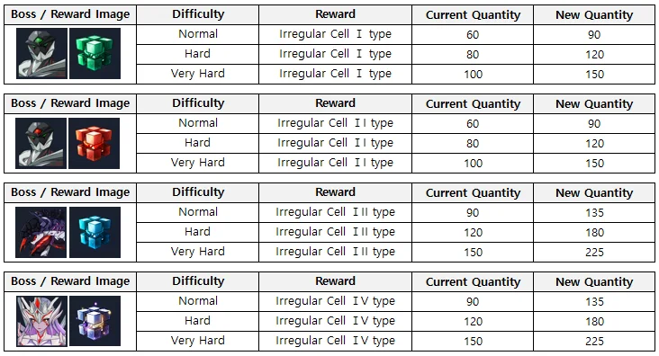 - Irregular Spike appearing on Floor 3 of Infiltration Operation: The following effect will be removed. ㄴ [Incomplete Evolution: Strong Bones] Greatly increases damage dealt to non-Ranger and non-Mage types, and reduces damage taken. 3) Irregular Blade appearing on Floor 3 of Infiltration Operation: At the start of battle, a 3-turn cooldown will now be applied to the following skill. ㄴ [Incomplete Evolution: Antlion] - Prices of certain items sold in Caren’s Supply Shop within Irregular Infiltration Operation will be reduced. - Irregular Cell rewards upon defeating bosses in Irregular Pursuit Operation will increase. (50% Increase)
