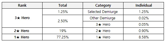 Ā Ā : Previous Demiurge heroes will be added to the Demiurge Recruit Pool and will be included as a possible 3-star recruit, and have a recruit chance different from other 3-star heroes.