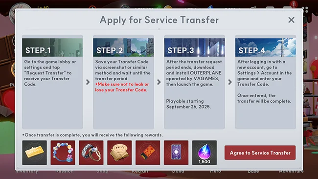 Ā ā»Ā You can access [Service Transfer] from the in-game [Settings] or [Service Transfer] on the main screen.